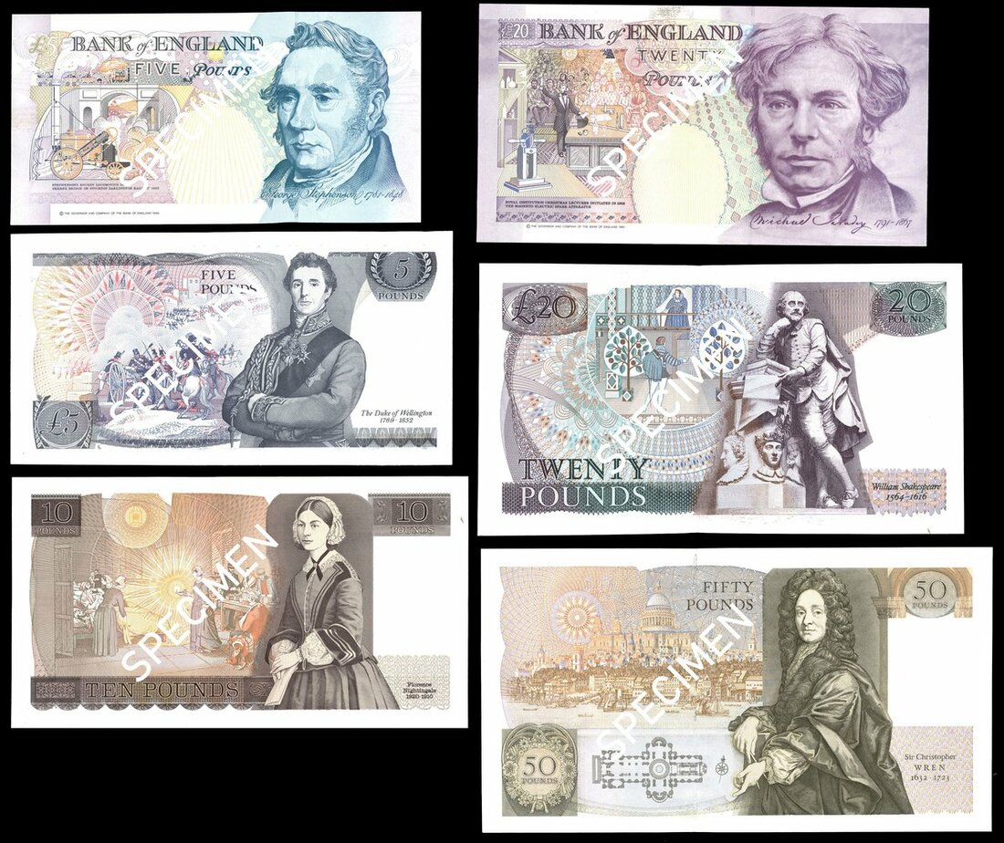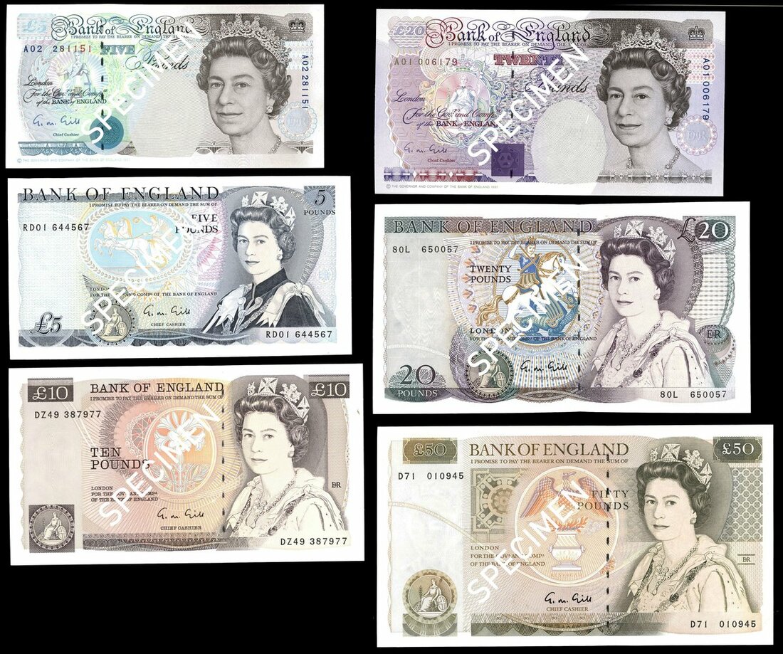 Bank of England, George Malcolm Gill, £5 Prefix RD01), £10, £20 and £50, ND (1988-), also £5 (prefix A02) and £20, ND (1990-), serial number A01 006179