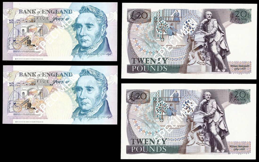 Bank of England, £20 (2), Kenfield, ND 1988, serial number 01T 773962, 63, also including £5 (2) Kenfield, serial number U01, 183277,78,