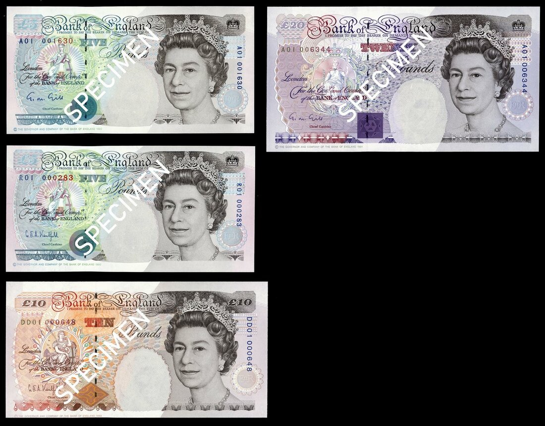 Bank of England, a group of low number notes, including Gill, £5 A01 0001630, £20 A01 006344, Kentfield, £5 R01 000283, £10 DD01 000648,