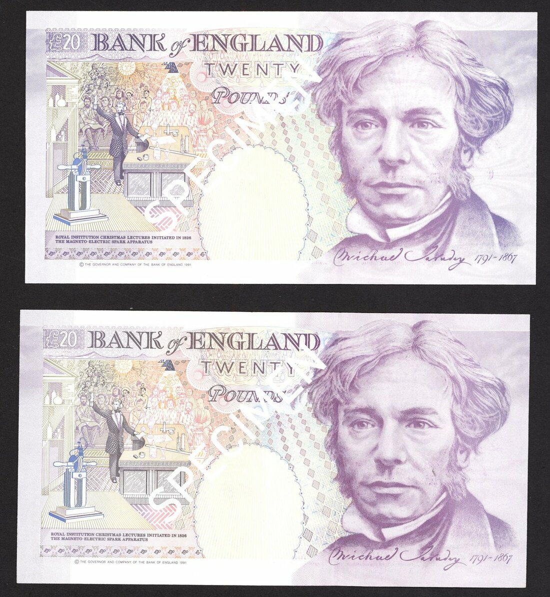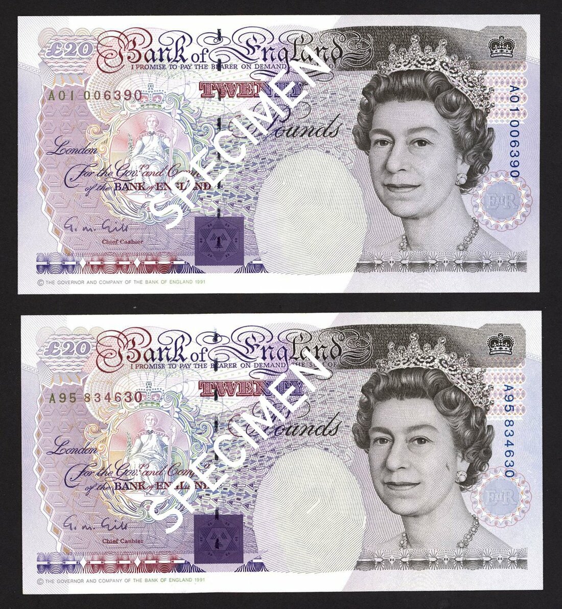Bank of England, George Malcolm Gill, £20 (2), ND (1991), serial number A01 006390, A95 834630, (EPM B358, B358cs), first run and column sort, UNC and EF respectively (2 notes)
