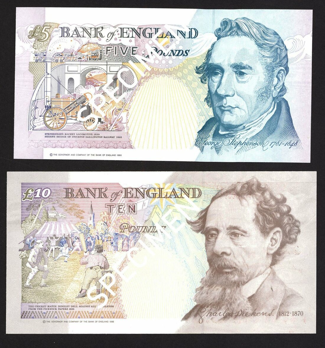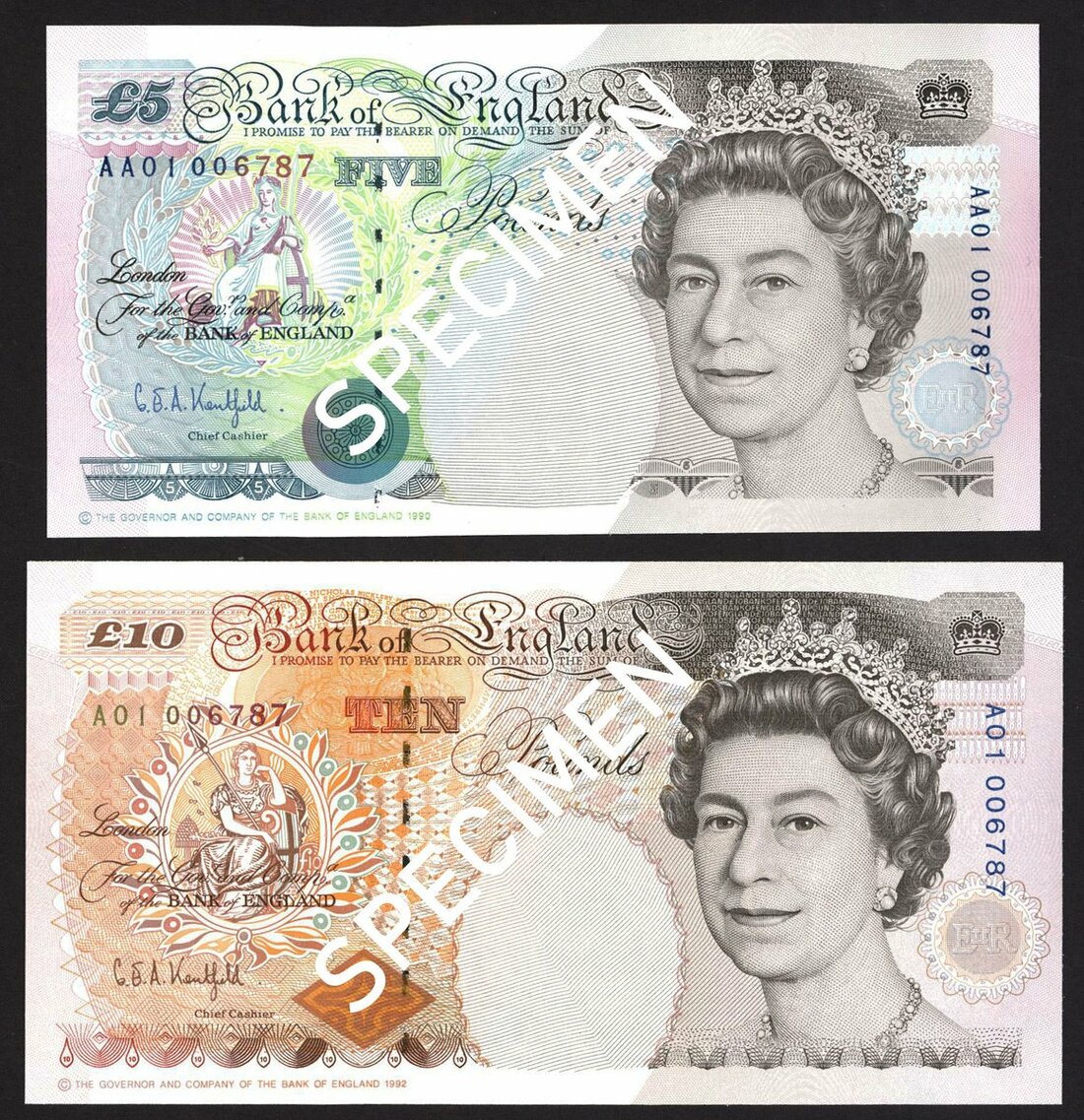 Bank of England, G.E.A. Kentfield, £5 and £10, ND (1992-93), prefixes AA01, A01, matching serial number 006787, (EPM B363, B366), first run matching low numbers, uncirculated (2 notes)