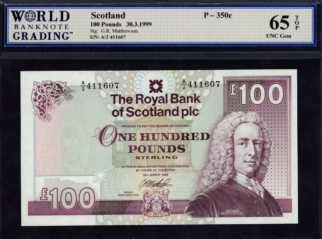 Royal Bank of Scotland Plc, £100, 30 March 1999, serial number A/2 411607, (PMS RB109b, Pick 350c), in WBG holder 65 TOP UNC Gem