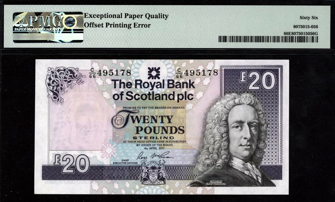 (x) Royal Bank of Scotland Plc, ERROR £20, 4 April 2017, serial number C/66 495178, (PMS RB16f), in PMG holder 66 EPQ Gem Uncirculated, offset printing error, scarce