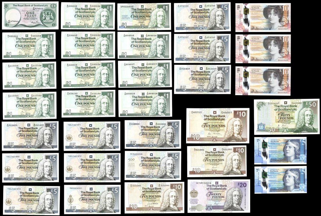 Royal Bank of Scotland Plc, including £1 (12), 1983, 1990, 1991, 1993, 1999, 2000, £5 (11), 1988, 1999, 2002, 2004, 2005, £10 (3), 1990, 1992, 2000, 'Queen Mother' £20 2000, £50 2005, Royal Bank of Scotland polymer £5 (2) and £10 (3) 2016,