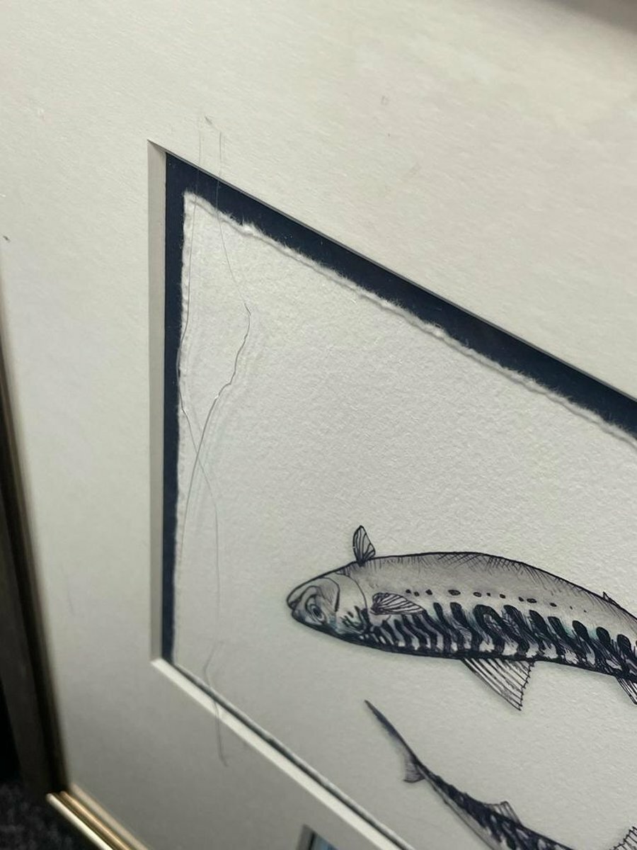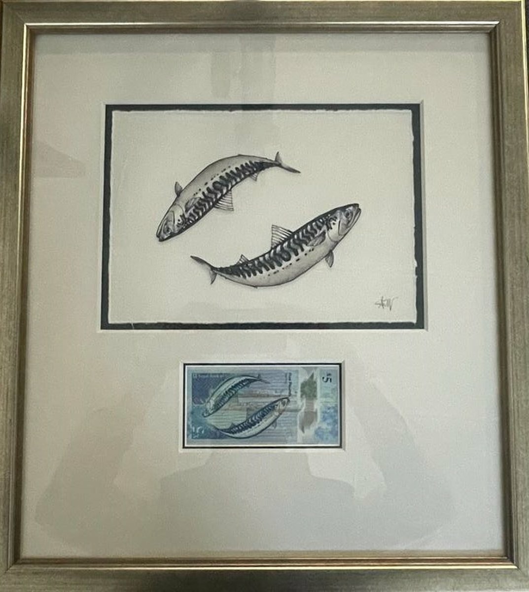 Royal Bank of Scotland plc., printed artwork for the reverse of the polymer £5 and depicting two mackerel, handsigned by the artist charming and a unique opportunity, due to transportation scratched plexy glass, sold as seen