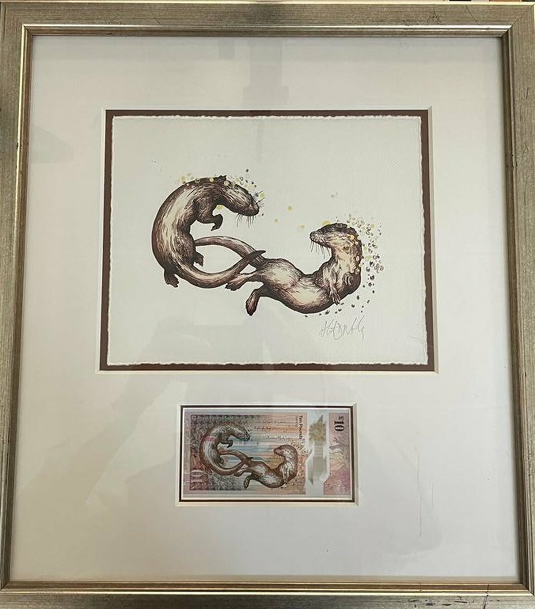 Royal Bank of Scotland plc., printed artwork for the reverse of the polymer £10 and depicting two otters, handsigned by the artist charming and a unique opportunity