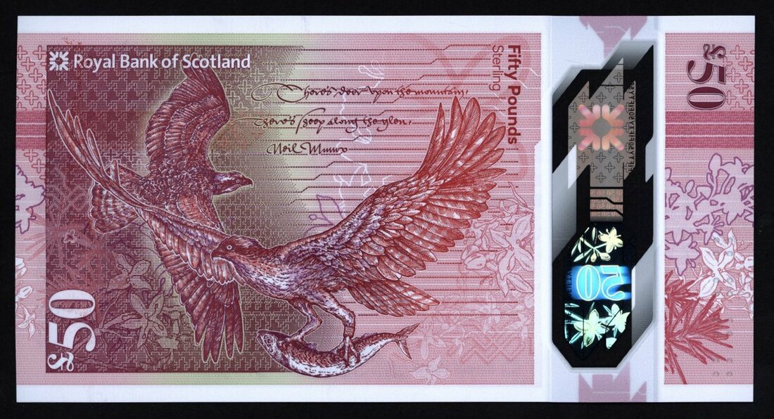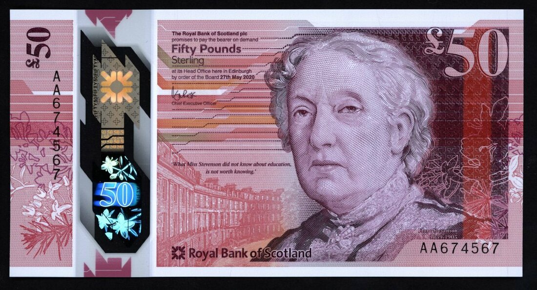Royal Bank of Scotland, polymer £50, 2020, serial number AA674567, first run, uncirculated