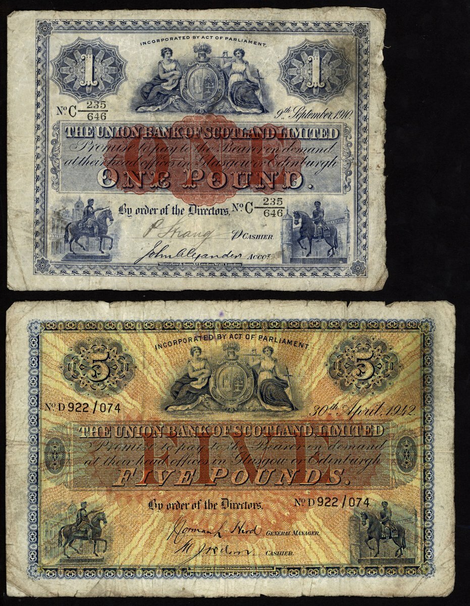 The Union Bank of Scotland, specimen £100 on thickish paper, 2 April 1867, black and white, value in green protector at centre, arms top centre flanked by value in ornate frames, equestrian statues at low left and right, plate A