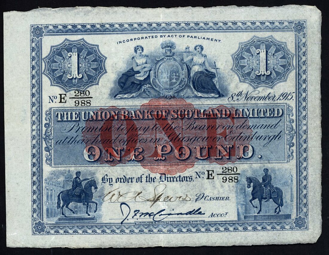 Union Bank of Scotland Limited, £1, 9 September 1910, serial number C 235/646, also a £5 1942,