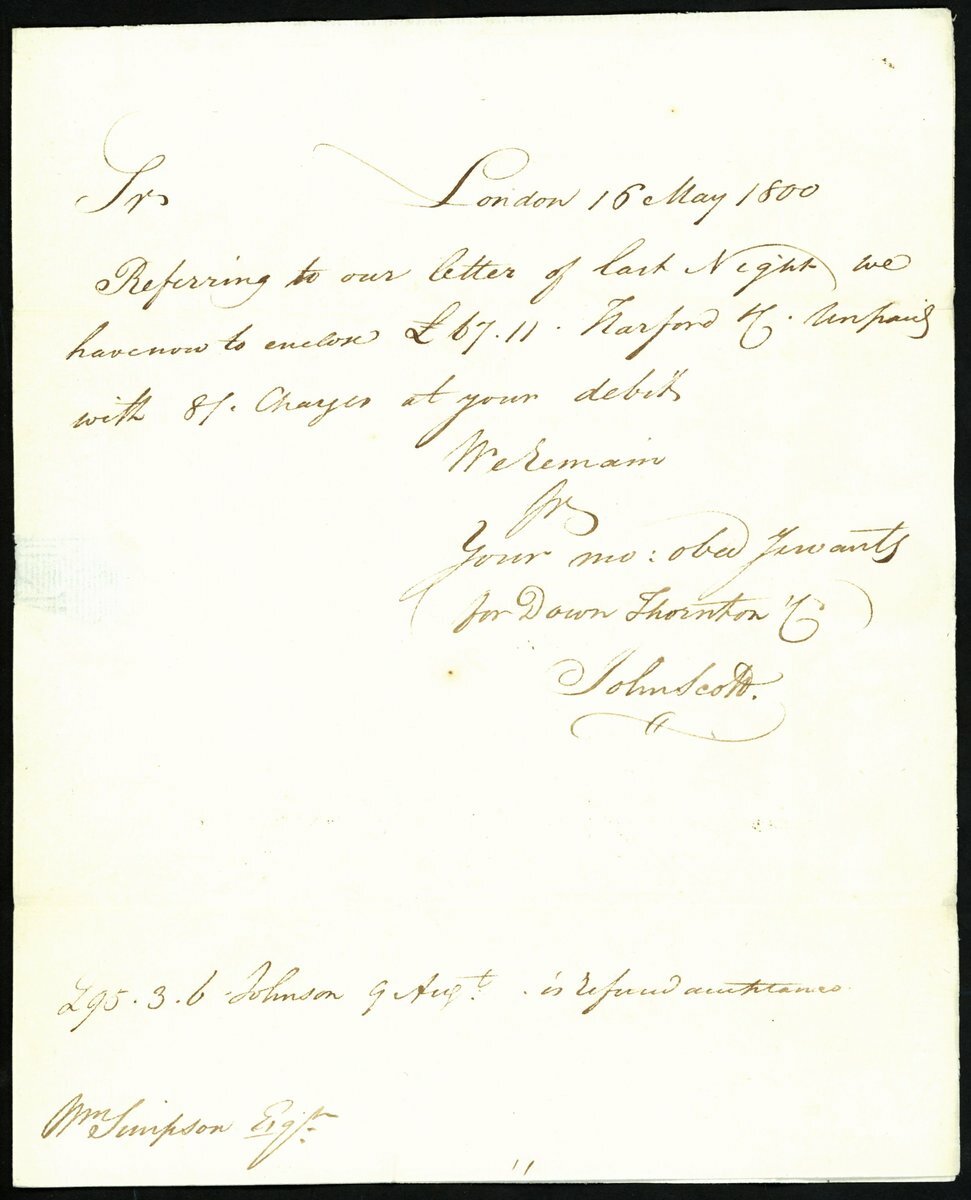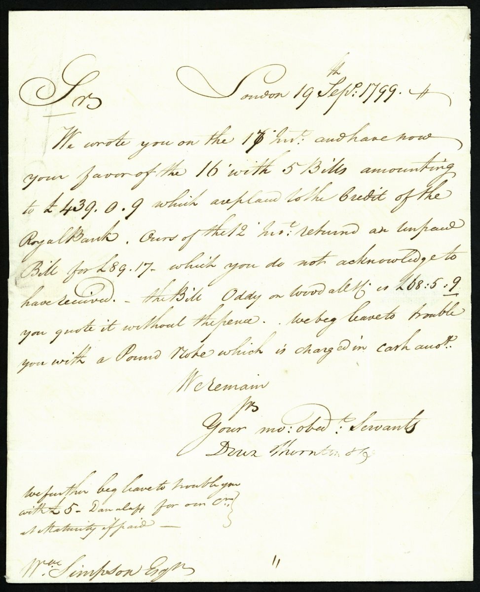 Down Thornton & Co. (Down, Thornton and Free), 2 letters addressed to the Royal Bank in Edinburgh, dated 19 September 1799 and 16 May 1800, referring to payments