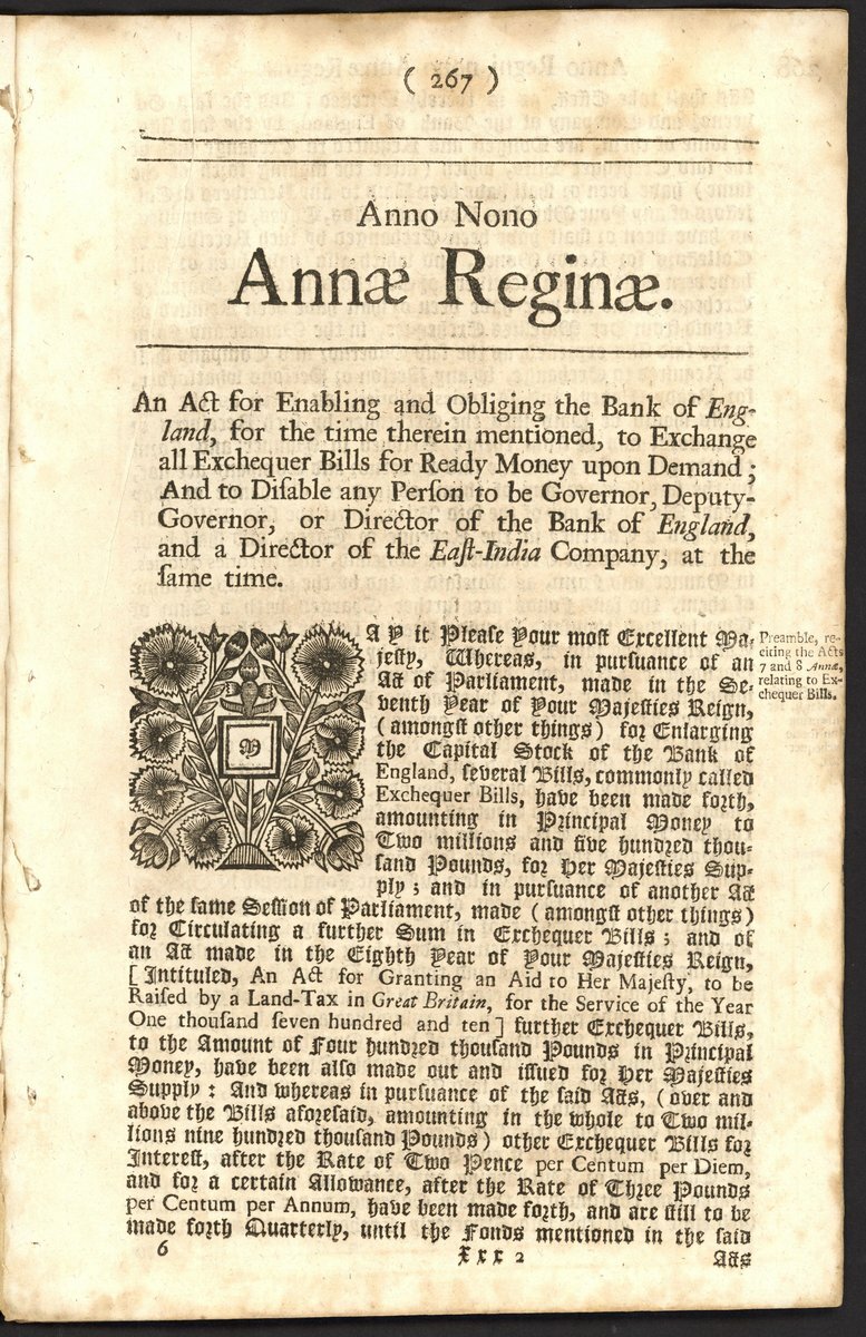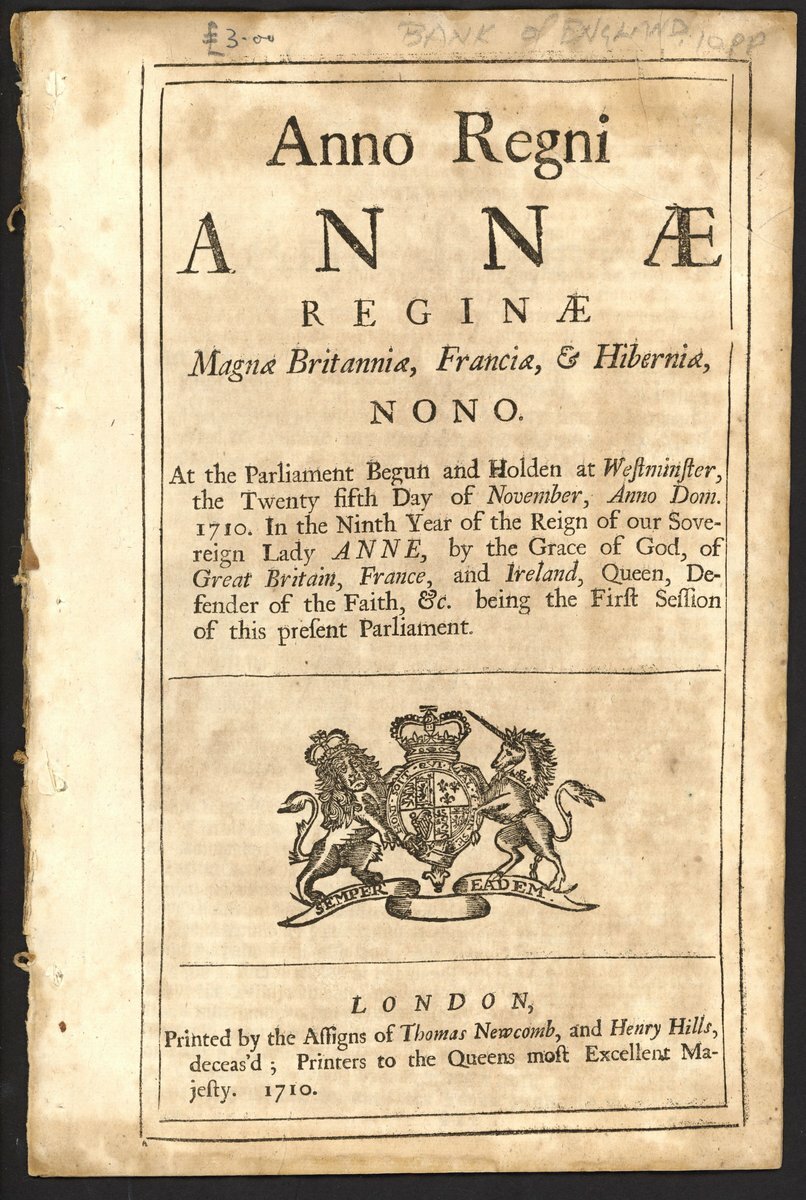 (x) Anna Regina, a pamphlet dated 25 November 1710, the ninth year of the reign of Queen Anne, printed by Thomas Newcombe and Henry Hills and detailing 'an Act for enabling and obliging the Bank of England, for the time therein mentioned, to Exchange all Exchequer bills for Ready Money upon Demand'