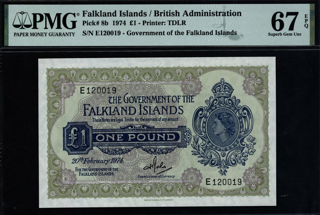 Government of The Falkland Islands, £1, 20 February 1974, serial number E120019, Queen Elizabeth II at right