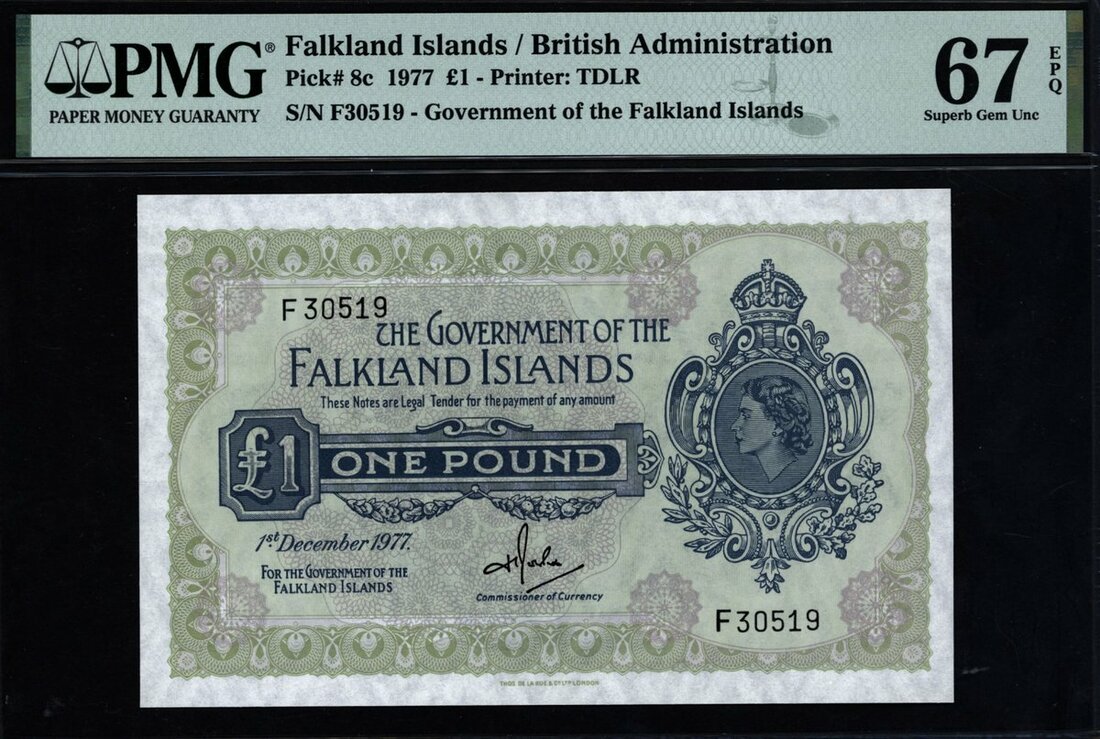 Government of the Falkland Islands, £1, 1 December 1977, serial number F30519, blue, green and lilac, crowned portrait of Elizabeth II at right, value in blue tablet at left