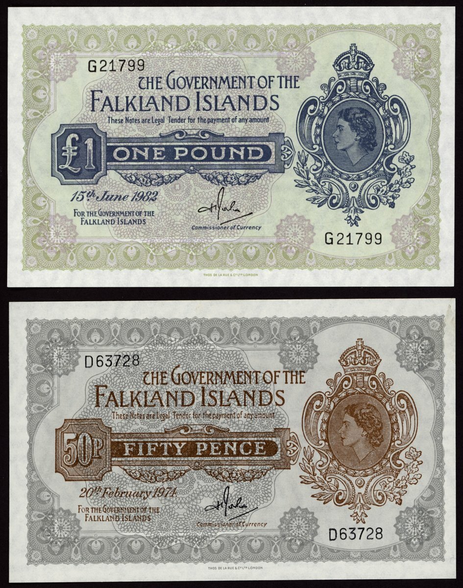 Government of The Falkland Islands, £1, 15 June 1982, serial number G21799, also a 50 pence, 20 February 1974, serial number D63728,