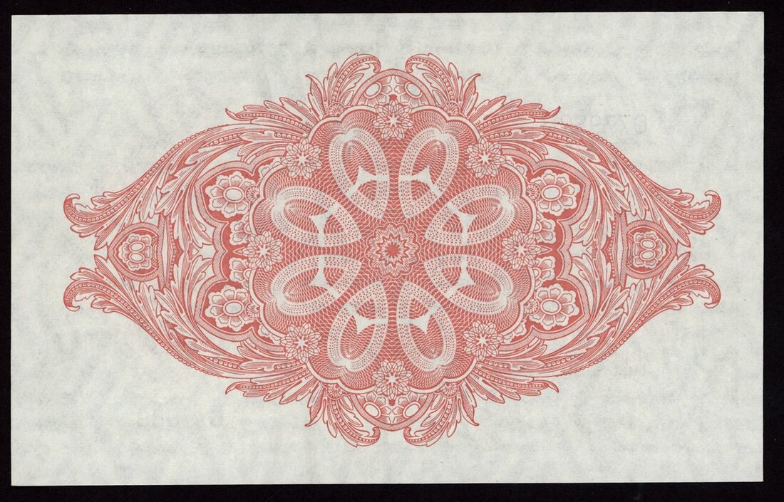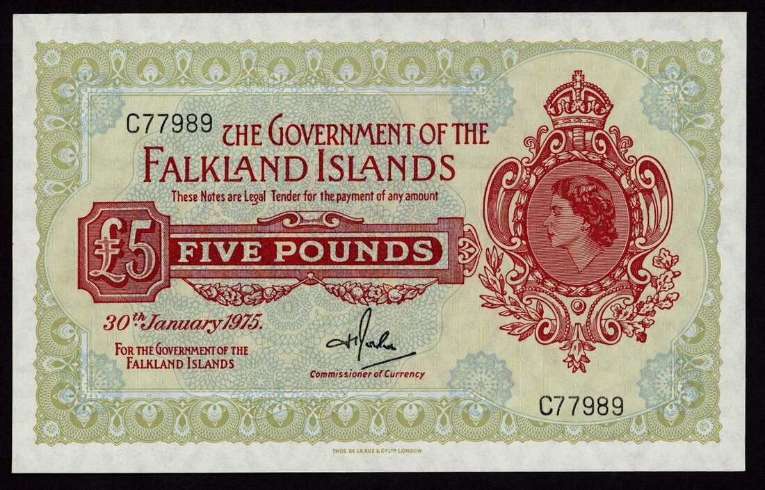Government of the Falkland Islands, £5, 30 January 1975, serial number C 77989, red and green, Elizabeth II at right, Rowlands signature