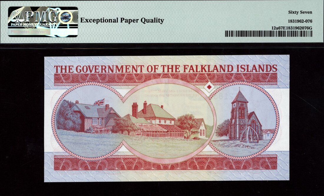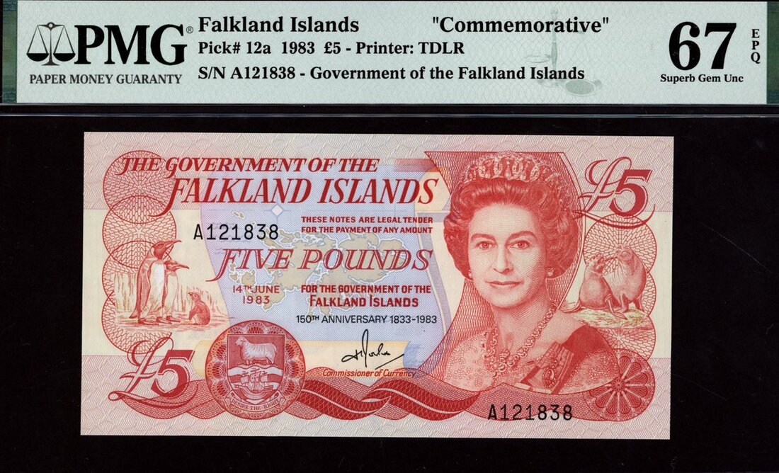Government of the Falkland Islands, £5, 14 June 1983, serial number A121838, (Pick 12a, TBB B217a), commemorating 150 anniversary of English rule of the Falkland Islands, in PMG holder 67 EPQ Superb Gem Uncirculated, only 1 note in a higher grade