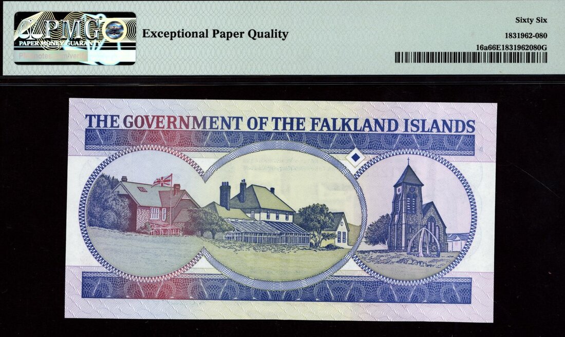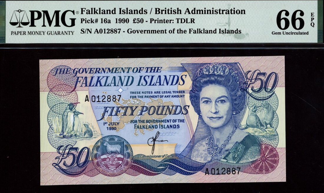 Government of the Falkland Islands, £50, 1 July 1990, serial number A012887, (Pick 16a, TBB B222a), in PMG holder 66 EPQ Gem Uncirculated