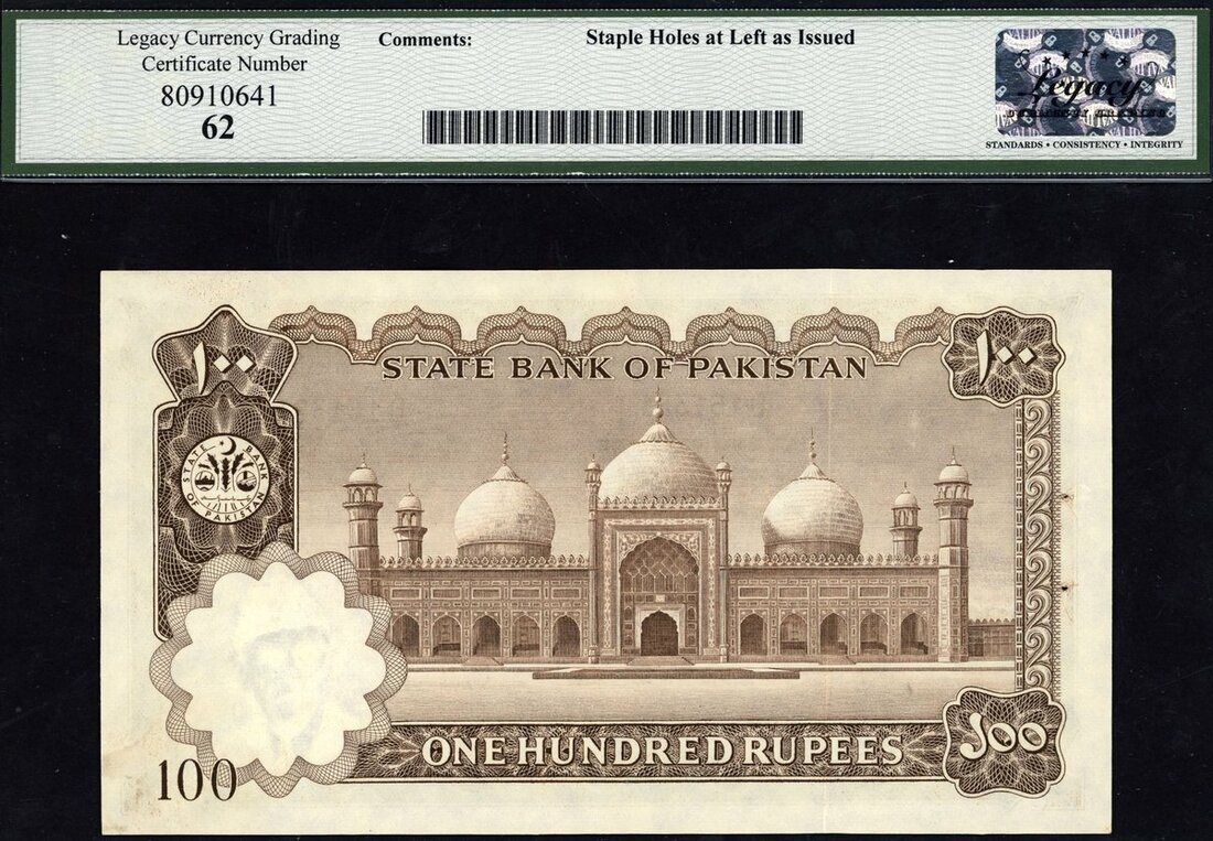 (x) State Bank of Pakistan, Haj Pilgrim issue, 100 rupees, ND (1972), serial number D161321, brown on multicolour underprint, Ali Jinnah wearing jacket and tie at left, reverse Royal Mosque in Lahore