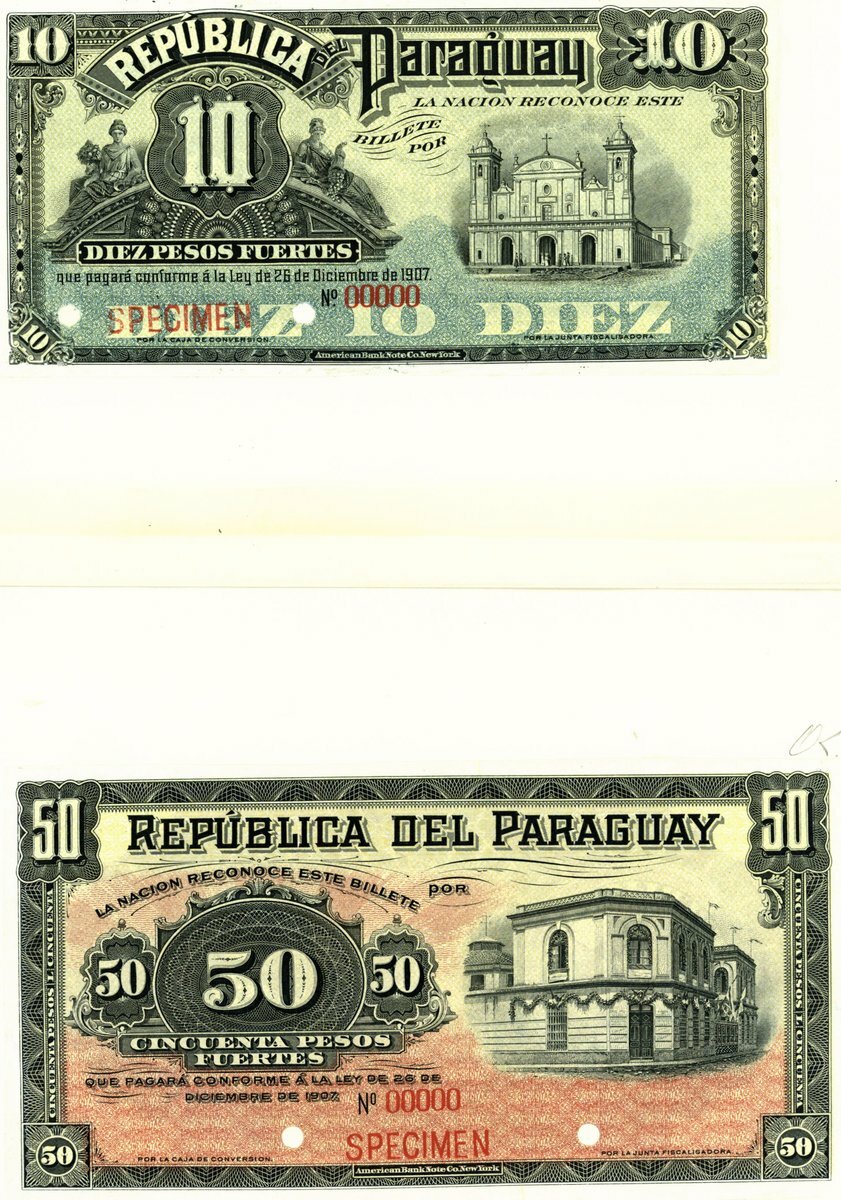 (x) Republica del Paraguay, obverse proofs for 10 and 50 pesos fuertes, 26 December 1907, zero serial numbers, (Pick 119p, 121p), both mounted on card with damage to card mounted, design unaffected (2 notes)