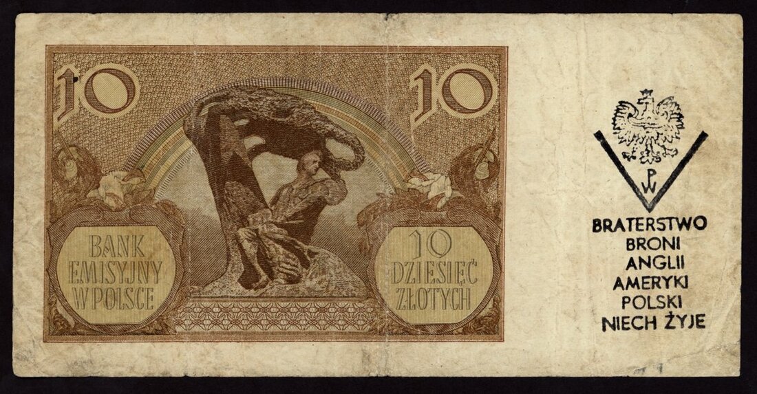 Poland, Warsaw Uprising, overprint on a 10 zlotych of 1920 (1944), reading BRATERSTWO BRONI ANGLII AMERYKI POLSKI NIECH ZYJE surmounted by a Polish eagle,