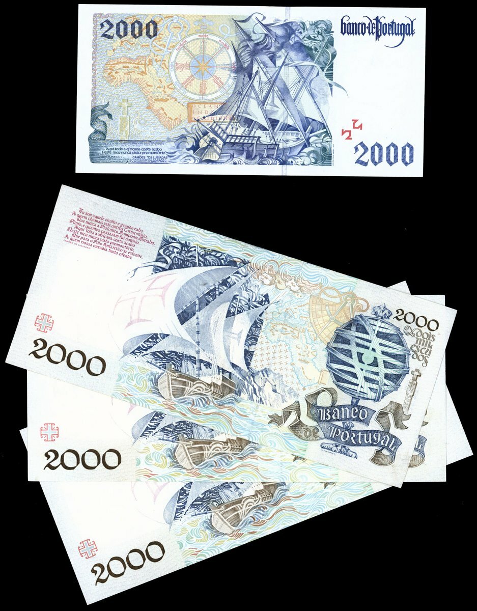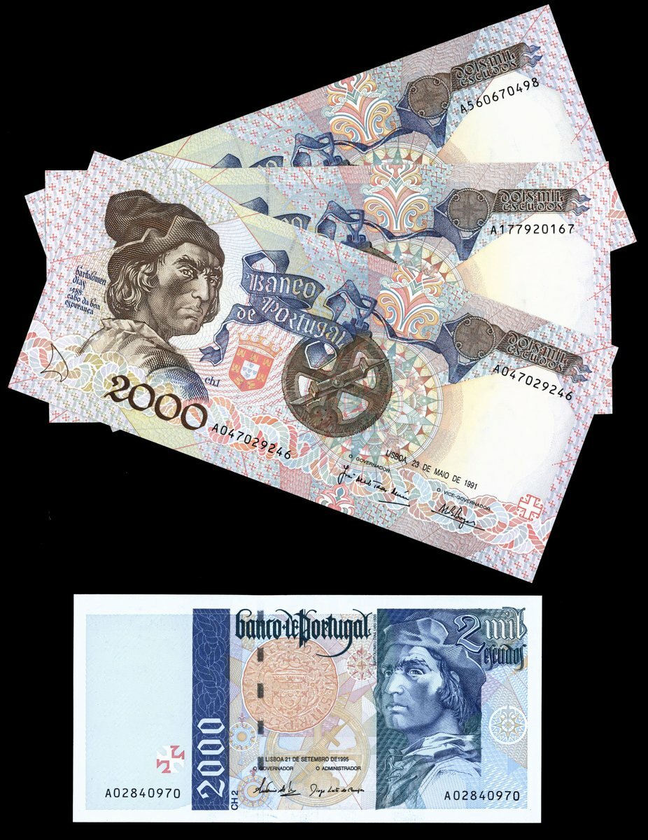 (x) Banco de Portugal, 2000 escudos (3), 1991, 1992, Ch.1, both prefix A, pink, blue and multicoloured, Bartolomeu Dias at left, also 2000 escudos, 1995