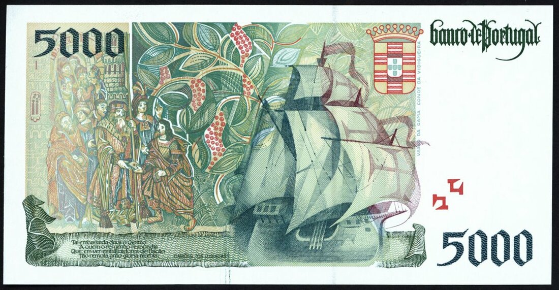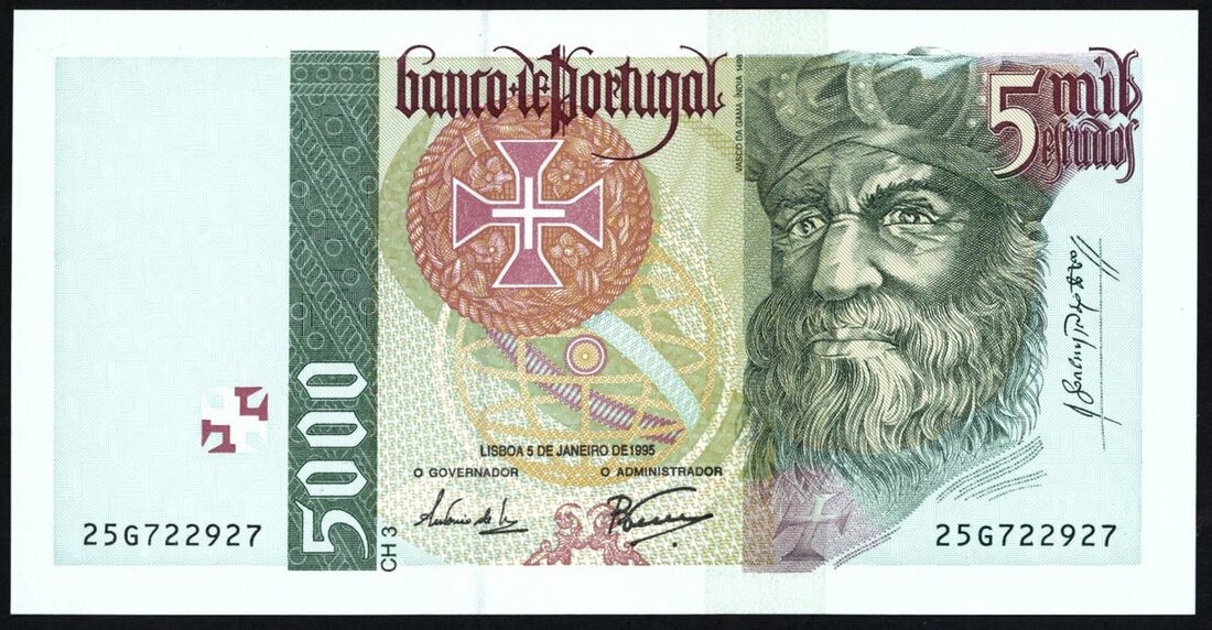(x) Banco de Portugal, 5000 escudos, 5 January 1995, prefix 25G, green and purple, Vasco de Gama at right
