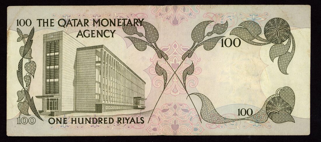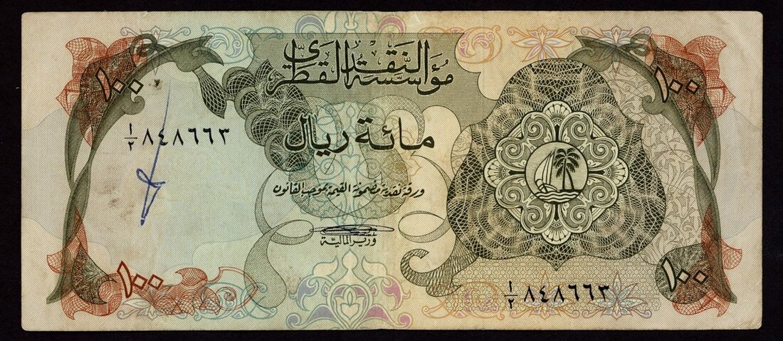 (x) Qatar Monetary Authority, 100 riyals, ND (1973), serial number A/2 848663, olive green, arms at right, reverse, Ministry of Finance building at left