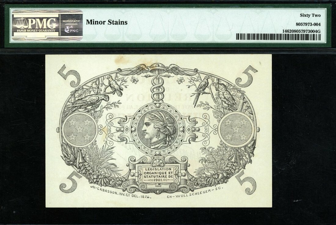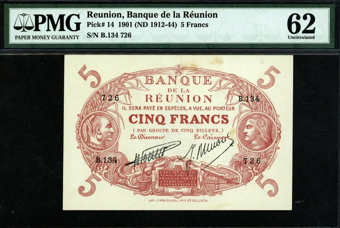 (x) Banque de la Reunion, 5 francs, ND (1912-44), serial number K.134726, red print, medallic heads at left and right
