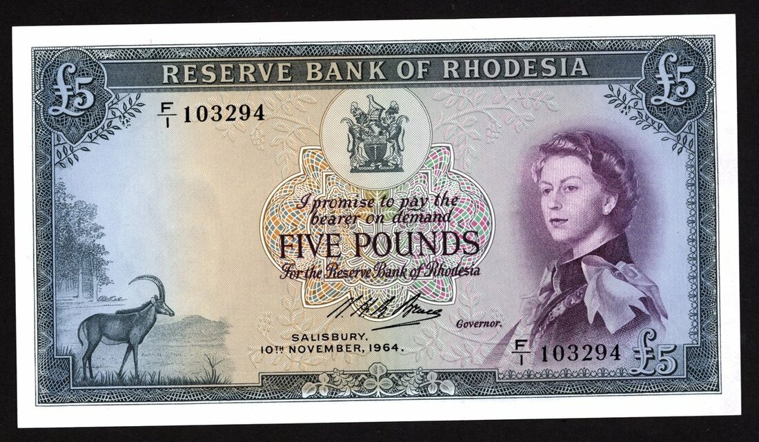 Reserve Bank of Rhodesia, £5, 10 November 1964, serial number F/1 103294, (Pick 26a, TBB B103a), uncirculated and scarce in this grade