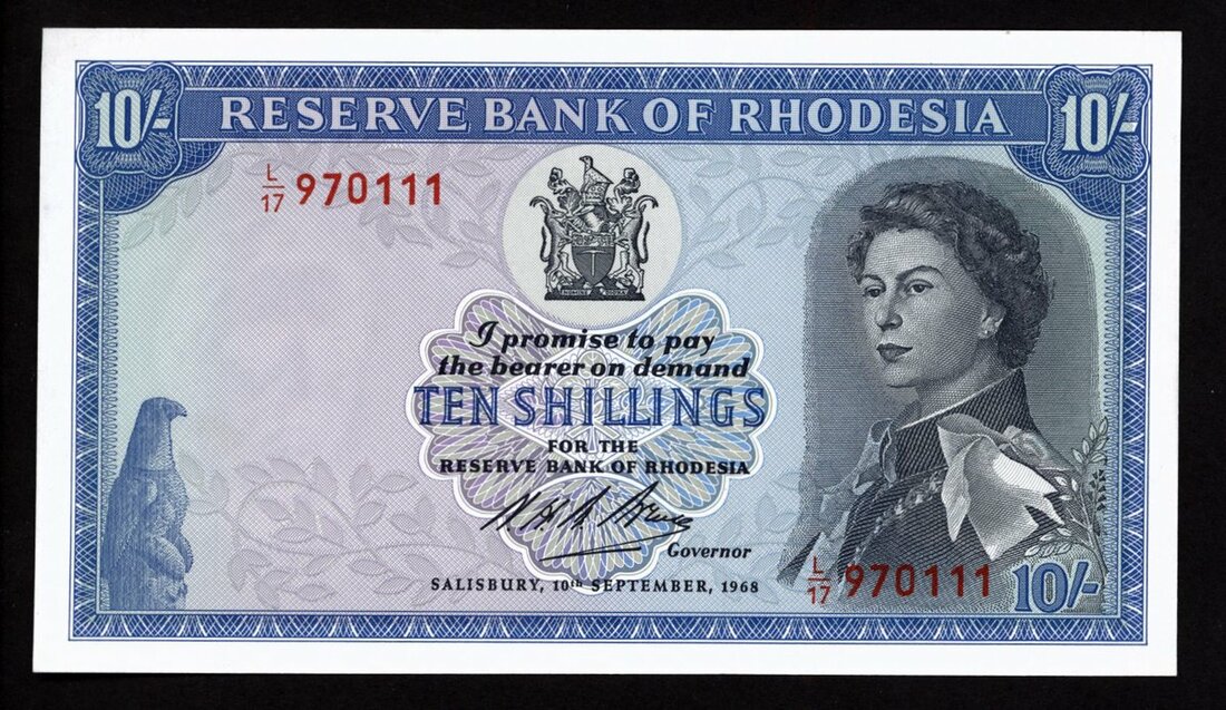 Reserve Bank of Rhodesia, 10 shillings, 10 September 1968, serial number L/17 970111, (Pick 27, TBB B104a), small flick at top left corner, about uncirculated