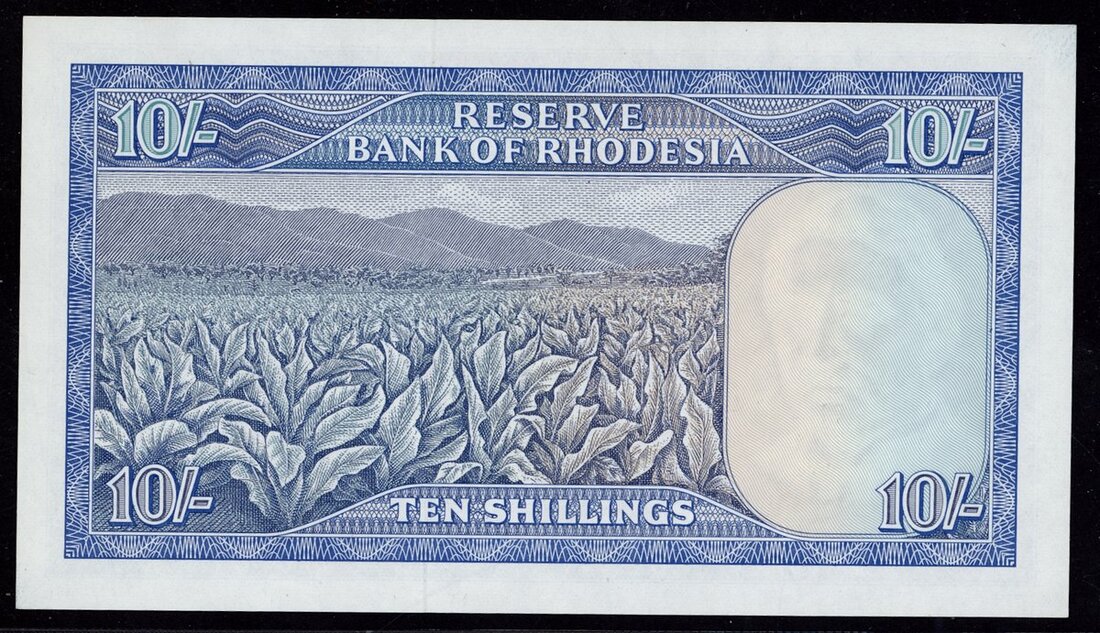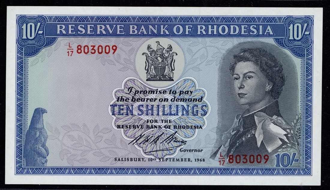 Reserve Bank of Rhodesia, 10 shillings, 10 September 1968, serial number L/17 803009, blue and lilac, Elizabeth II at right, arms top centre, stone falcon low left, Noel Bruce signature low centre, reverse blue, tobacco field