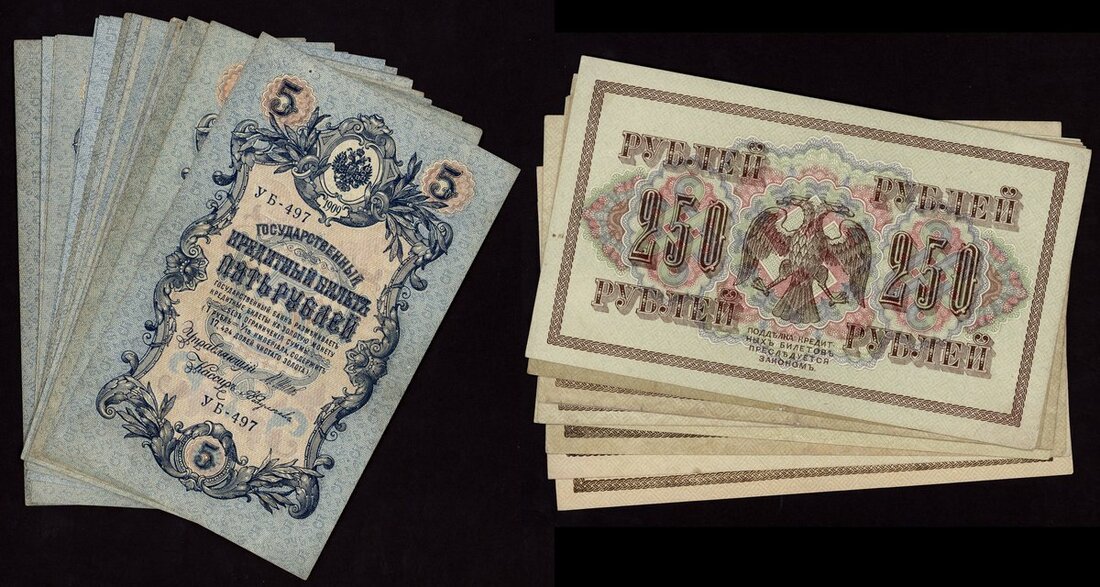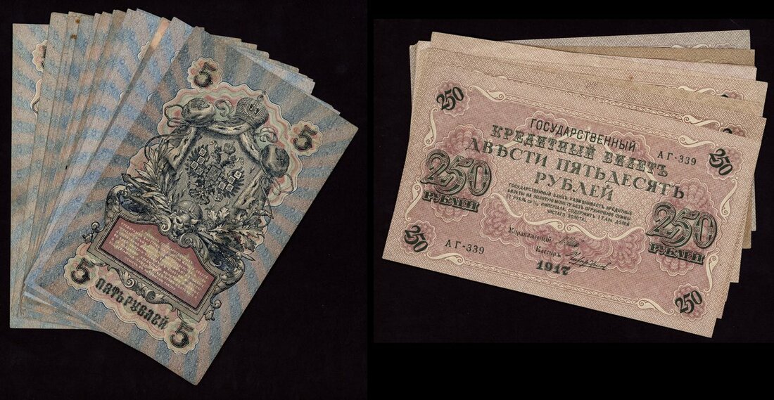 First Soviet Issue, 5 rubles (20), 250 rubles (10) 1917, (Pick 35, 36, Raybch 800, 809), good fine to good extremely fine (30 notes)