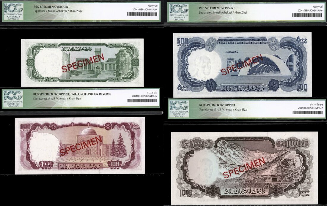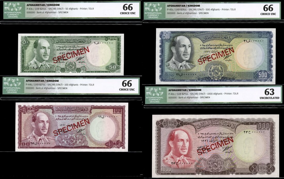 Afghanistan Bank, a set of the 1967 issue specimens, including 50, 100, 500 and 100 afghanis, (Pick 43s-46s), in ICG holders 66 Choice Unc, 1000 63 Uncirculated (4 notes)
