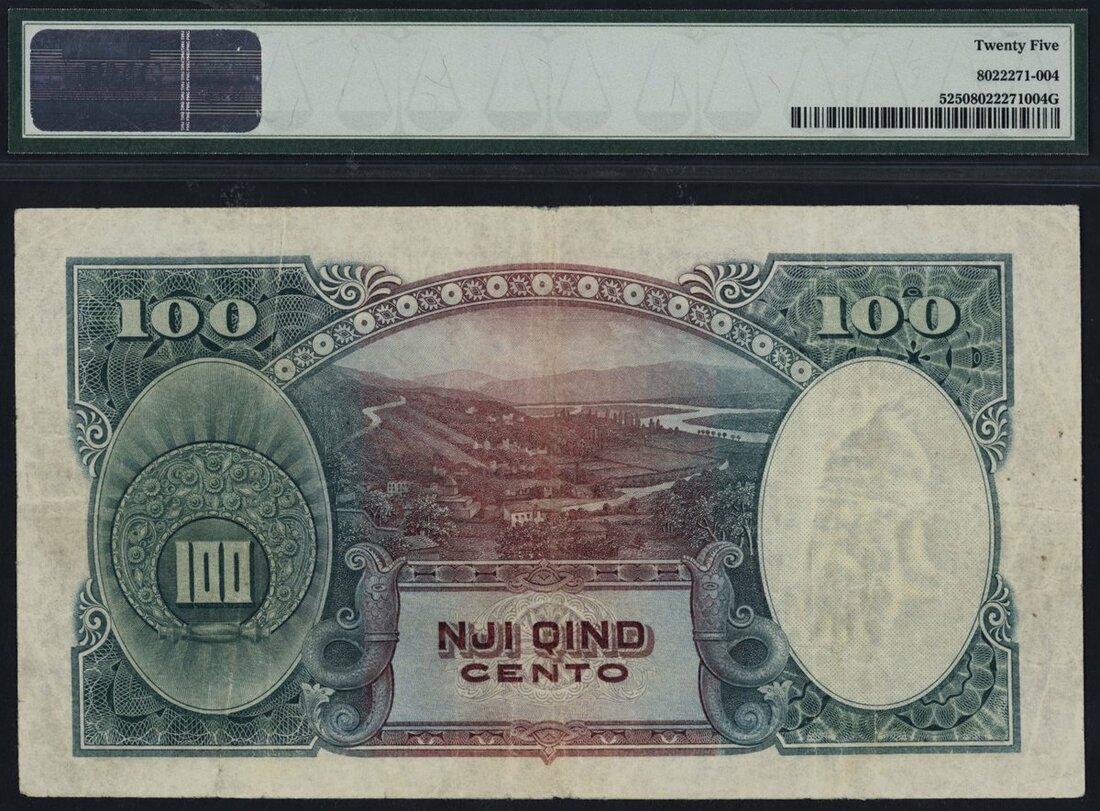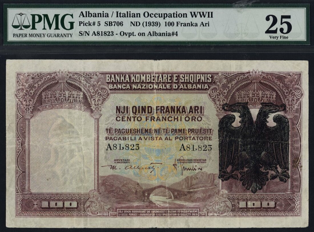 (x) Albania, Italian Occupation WWII, [Top Pop] 100 franka Ari, ND 1939, serial number A 81823, double-headed eagle black handstamp at right, reverse, the Drin river at centre