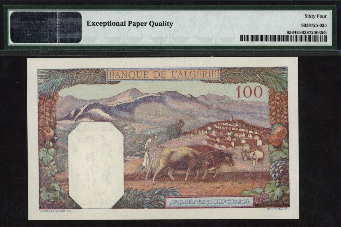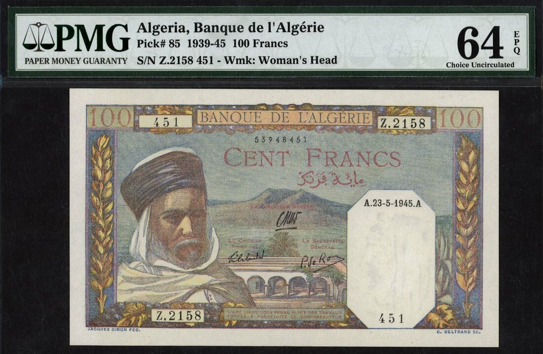 (x) Banque de l'Algerie, 100 francs, 1945, serial number Z.2158 451, (Pick 85, TBB B131c), in PMG holder 64 EPQ Choice Uncirculated