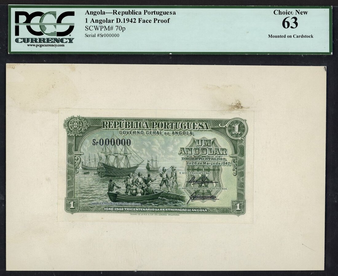 (x) Republica Portuguesa, Angola, an obverse composite essay on board for a 1 angolar, 28 March 1942, serial number Sr 000000, green, Dutch prisoners and galleons in Luanda, arms top left