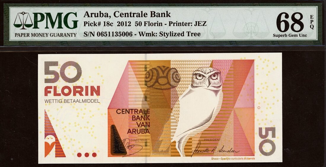 (x) Centrale Bank van Aruba, [Top Pop] 50 florin, 2012, serial number 0651135006, (Pick 18c), in PMG holder 68 EPQ Superb Gem Unc