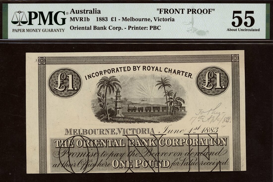 (x) Oriental Bank Corporation, Australia, proof £1, 1 June 1883, (Pick unlisted, MVR1b), in PMG holder printer's annotations, previously mounted, cut cancelled, 55 About Uncirculated, scarce