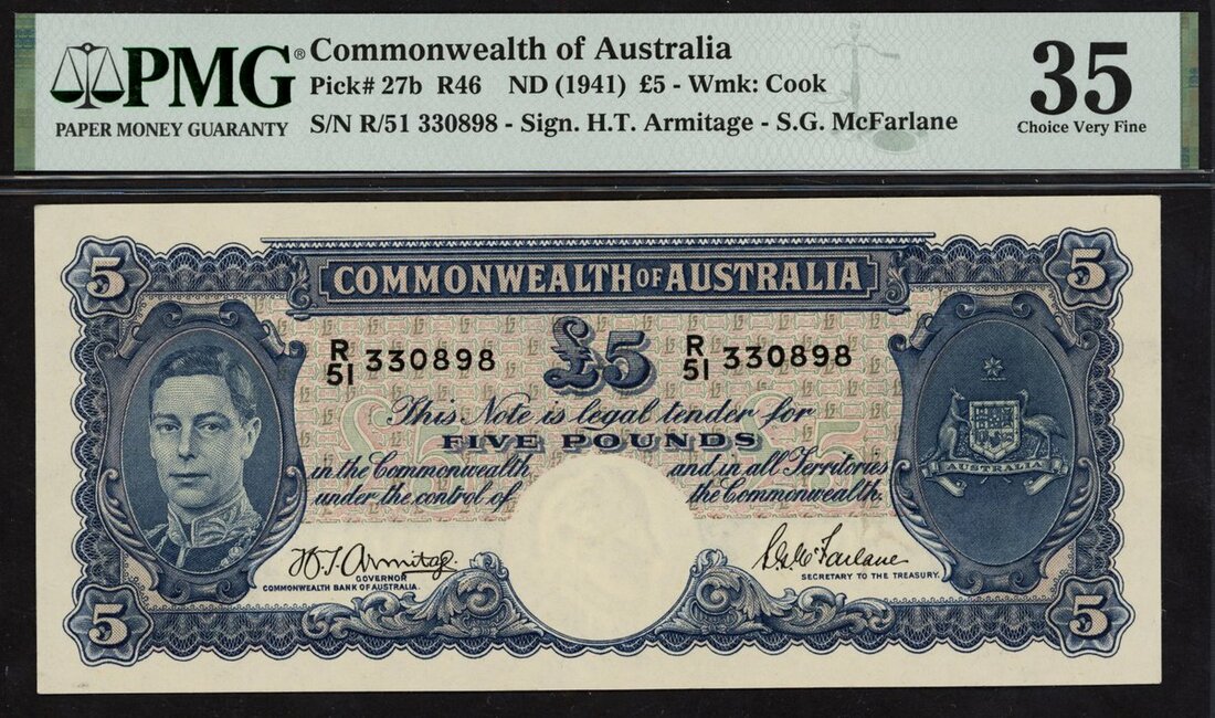 Commonwealth of Australia, £5, ND (1941), serial number R/51 330898, (Pick 26b, Renniks 46), in PMG holder 35 Choice Very Fine