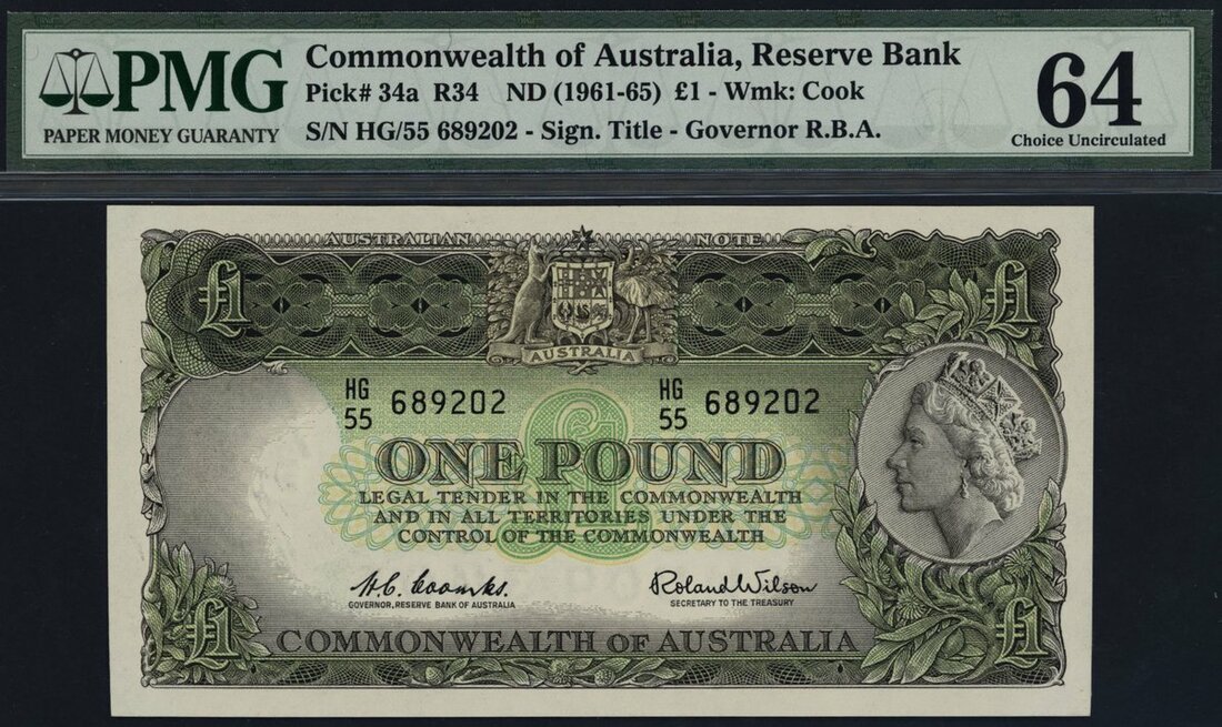 (x) Commonwealth of Australia, £1, ND (1961-65), serial number HG/55 689202, (Pick 34a, Renniks 34), in PMG holder 64 Choice Uncirculated