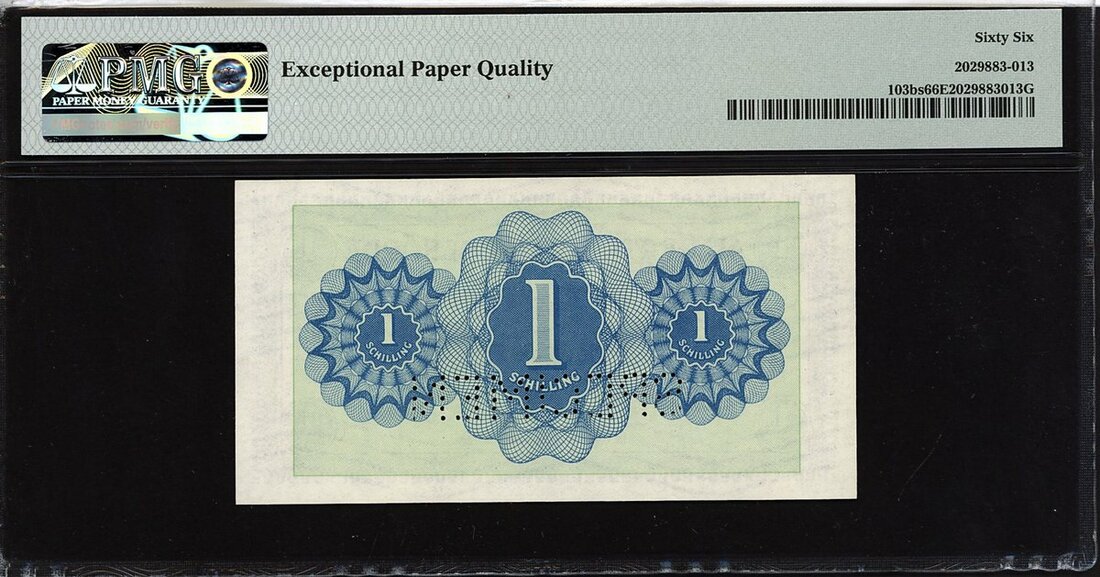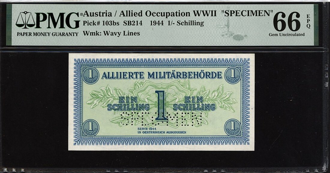 Austria, Allied Occupation WWII, [Top Pop] specimen 1 schilling, 1944, (Pick 103bs, Schwan-Boling 214s), in PMG holder 66 EPQ Gem Uncirculated