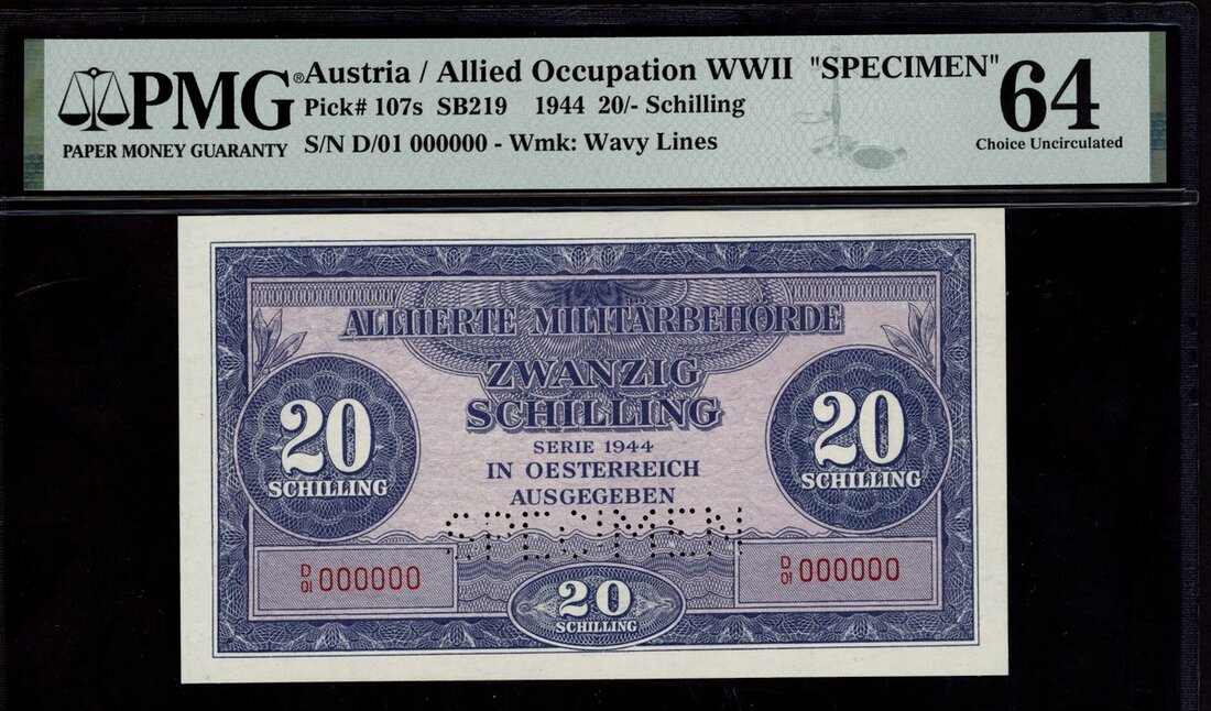 Austria, Allied Occupation WWII, specimen 20 schilling, 1944, serial number D/01 000000, (Pick 107s, Schwan-Boling 219s), in PMG holder 64 Choice Uncirculated