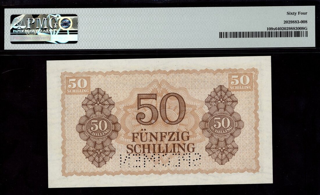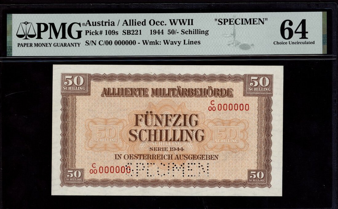 Austria, Allied Occupation, WWII, specimen 50 schilling, 1944, serial number C00 000000, (Pick 109s, SB221),, in PMG holder 64 Choice Uncirculated, second highest grade on PMG Census
