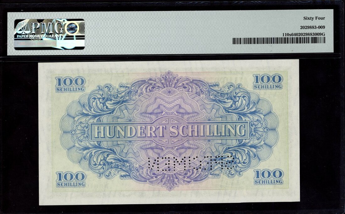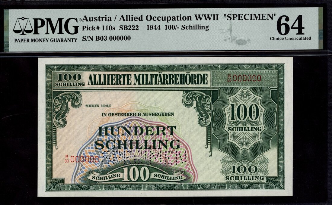 Austria, Allied Occupation WWII, specimen 100 Schilling, 1944, serial number B03 000000, (Pick 110s, SB222), in PMG holder 64 Choice Uncirculated