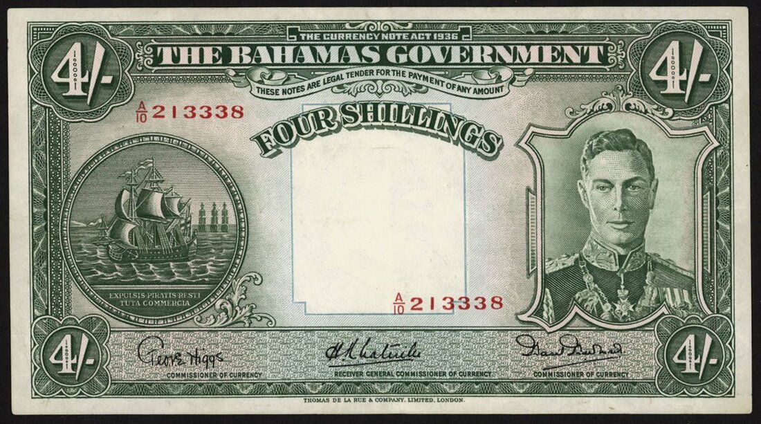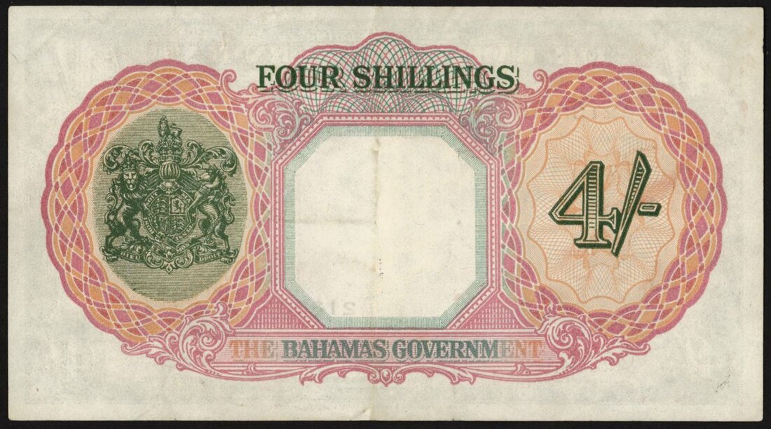 The Bahamas Government, 4 shillings, ND (1947), serial number A/10 213338, (Pick 9e, TBB B108e), good very fine