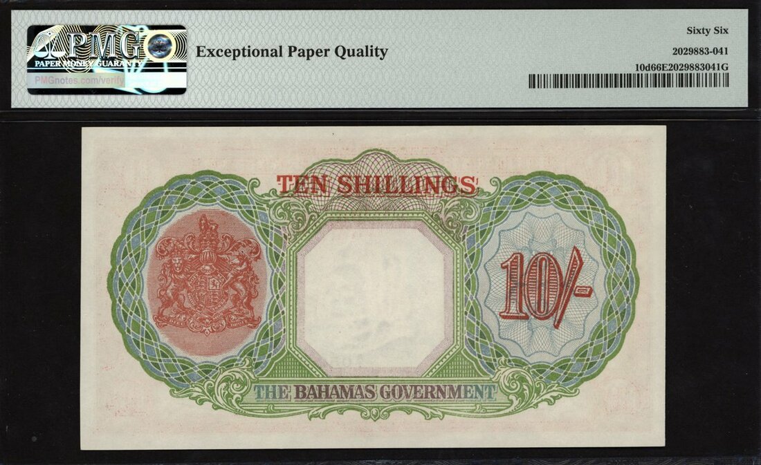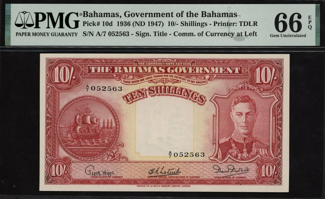 (x) The Bahamas Government, 10 shillings, ND (1947), serial number A/7 052563, (Pick 10d, TBB B109), in PMG holder 66 EPQ Gem Uncirculated. One of three PMG Census top grade example, scarce high grade example