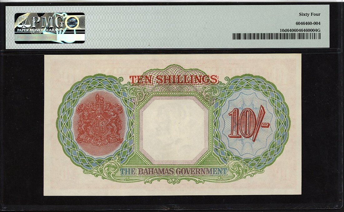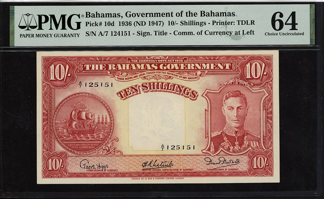 The Bahamas Government, 10/-, (ND 1947), serial number A/7 124151, (Pick 10d), in PMG holder 64 Choice Uncirculated