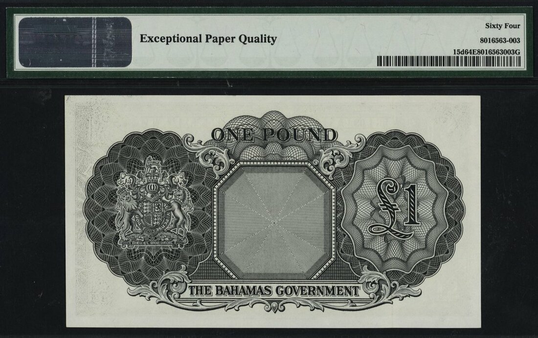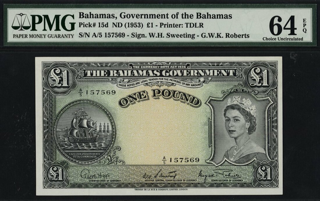 (x) The Bahamas Government, $1, ND (1953), serial number A/5 157569, (Pick 15d, TBB B114d), last date, in PMG holder 64 EPQ Choice About Unc, lovely example