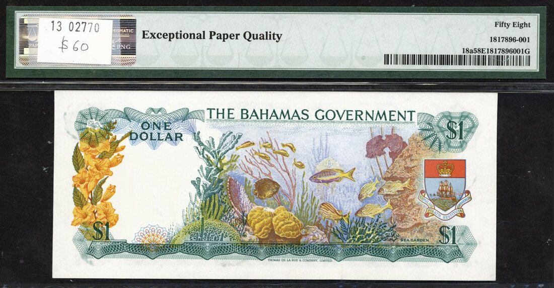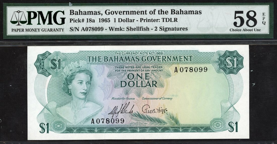 (x) The Bahamas Government, $1, 1965, serial number A078099, (Pick 18a, TBB B117a), in PMG holder 58 EPQ Choice About Unc