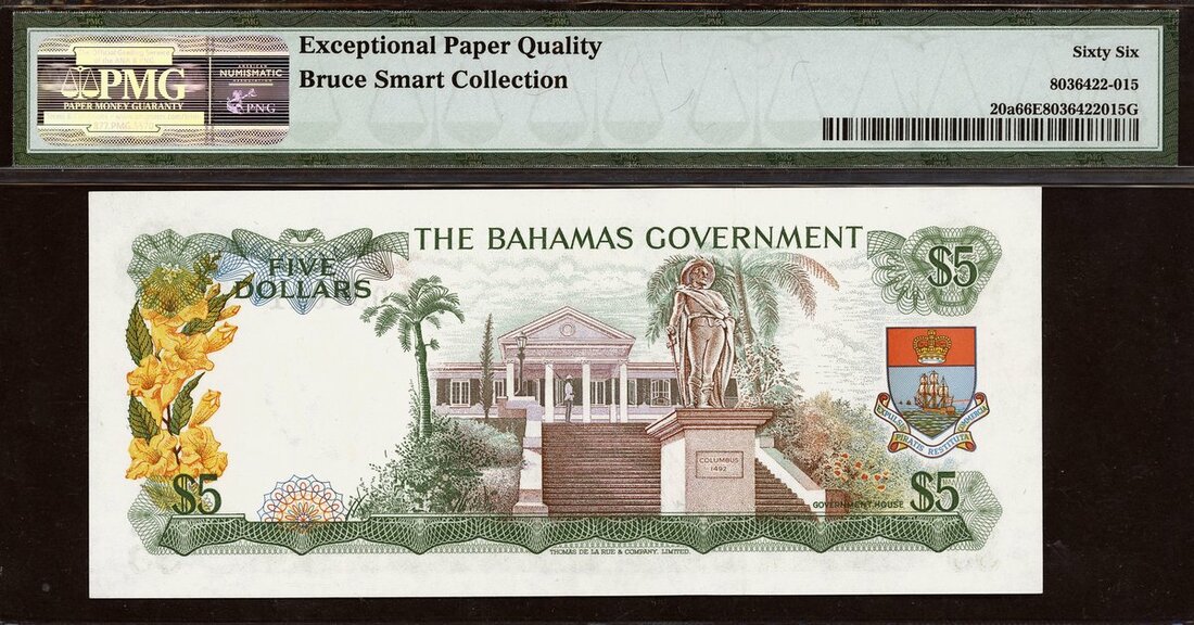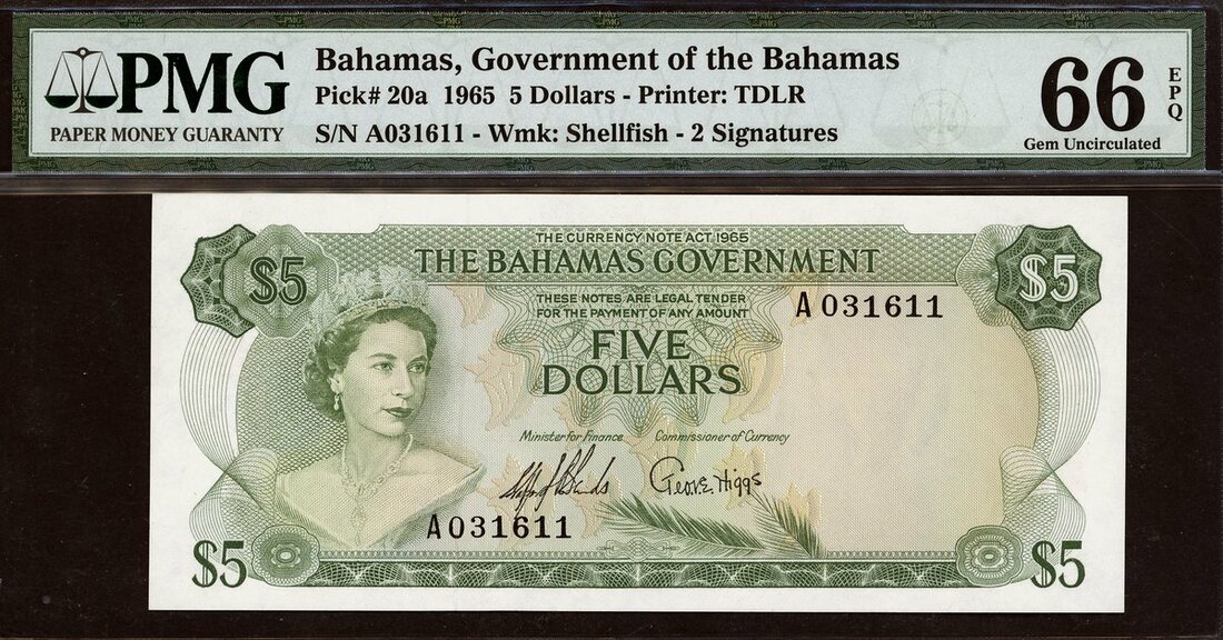 (x) The Bahamas Government, 5 dollars, 1965, serial number A031611, (Pick 20a, TBB B119), in PMG holder 66 EPQ Gem Uncirculated